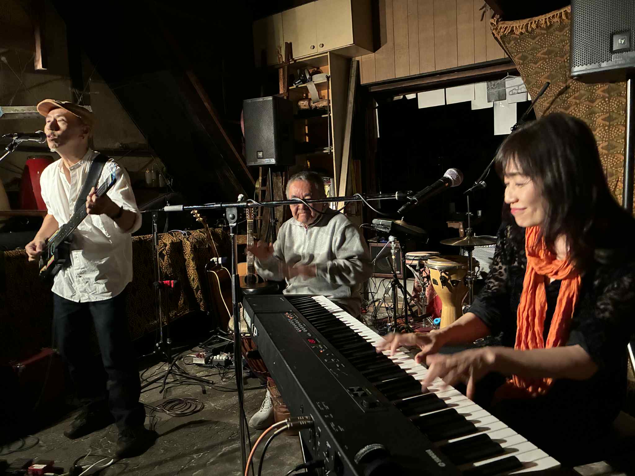 とは云へけふはメンバーの半分が不参加。演奏部は私としーなさんとヴィヲロンの竹内ふみのの3人のみ。本番ではここにベースの中野チカラさん、パーカスに宮本かおりチャンが加わり、これに姫石ミミ、田辺ユミコ、亀田敬子の歌が乗る。チカラさんはウッドベースで「下」を固め、もぅひとりの私は唯一の電化楽器のメリットを活かし、まぁ「シンセ」のニッチに。