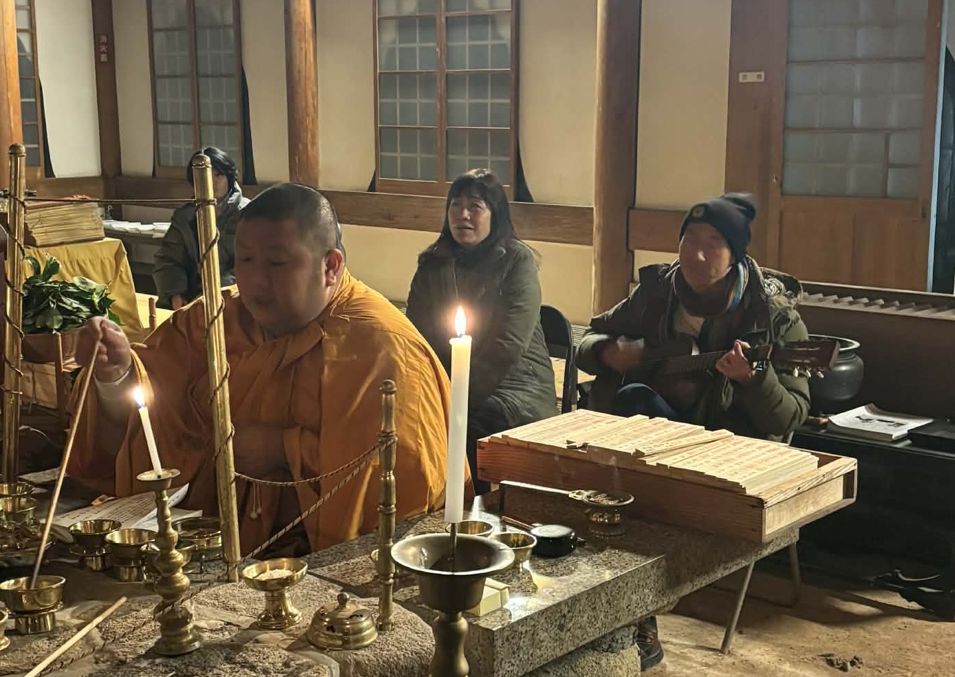 無事に登頂を済ませ、日付が変わる手前ぐらいから本堂で奉納演奏をスタート。PAも鍵盤もなく、伴奏は私のギターのみ。目の前には護摩を炊く住職の背中。その後ろには巨大な不動明王像。大晦日の寺院で演奏したことは初めてではないが、かういふ形のパフォームは初めてだ。冷え冷えとした本堂にえせニック・ヴォイスが響き渡る。非常に得難い経験だった。